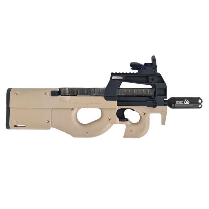 Beheers het terrein met onze elektrische full-auto P90 uitgerust met een LED metalen tracer voor traceerkogels (spectaculair lichteffect) en een meegeleverd vizier om snel en precies te richten. Behuizing van hoogwaardig nylon, hoge vuursnelheid, premium gevoel.